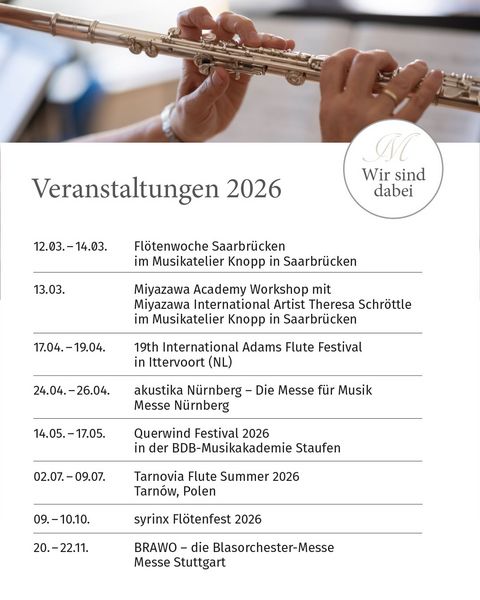 Autorisierte Miyazawa Stützpunkthändler ermöglichen Ihnen, Miyazawa Querflöten ausgiebig zu testen. Zusätzlich bieten wir auf Veranstaltungen und Messen die Möglichkeit, unsere Flöten direkt auszuprobieren und sich persönlich von uns beraten zu lassen. Unsere Veranstaltungen 2026