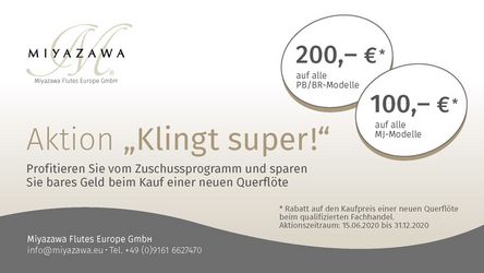 Ab dem 15.06.2020 bieten wir Ihnen eine tolle Rabattaktion. Beim Kauf einer neuen Querflöte bei einem qualifizierten Fachhandel profitieren Sie von unserem Zuschussprogramm und sparen bares Geld.