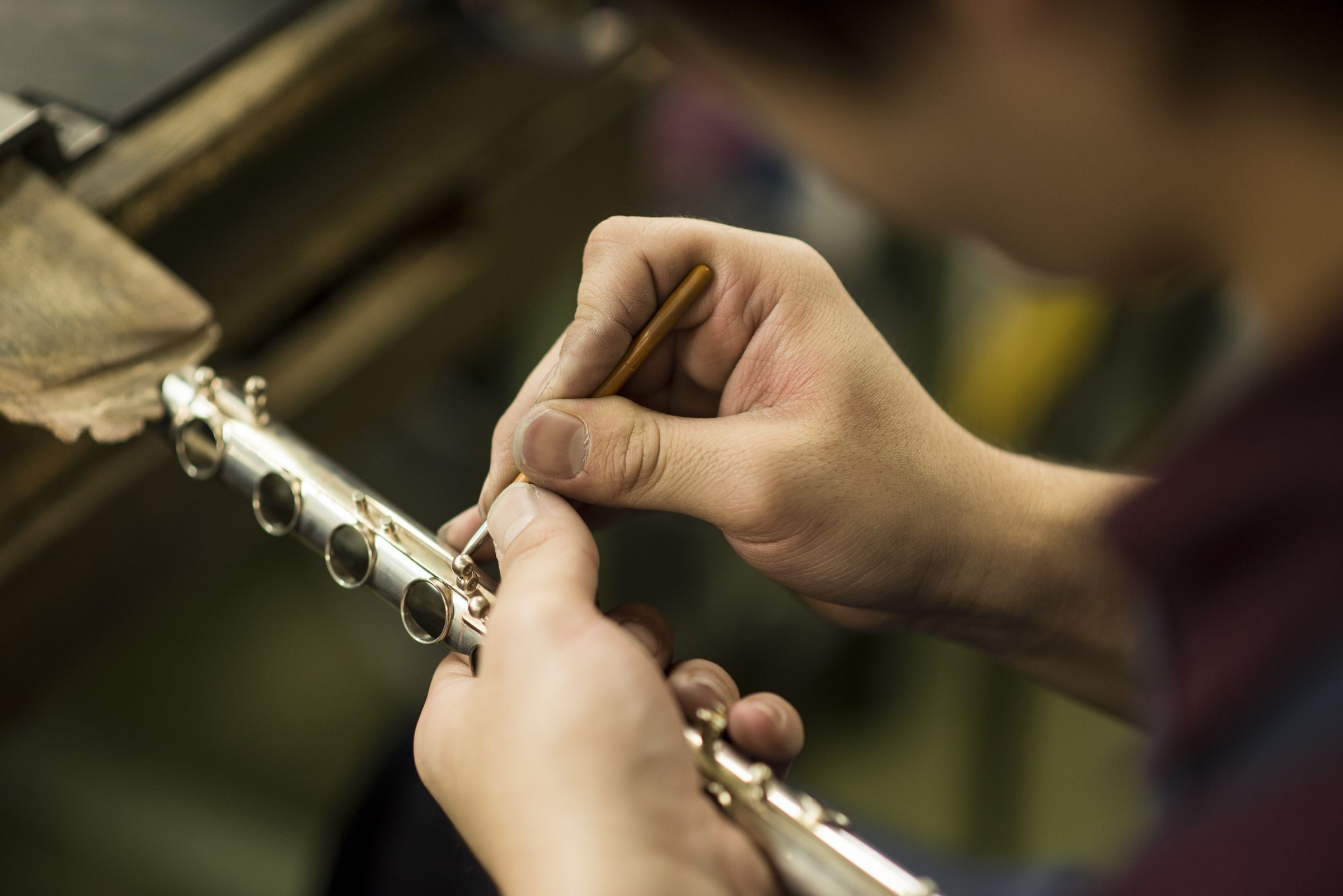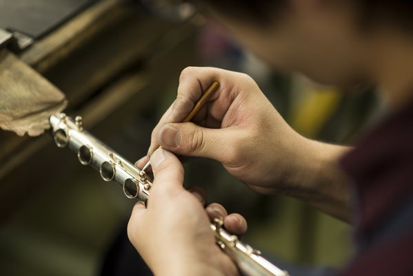 Jeder Arbeitsschritt wird mit größter Sorgfalt ausgeführt, da bereits kleinste Ungenauigkeiten die spätere Mechanik und Optik der Querflöte beeinflussen können.