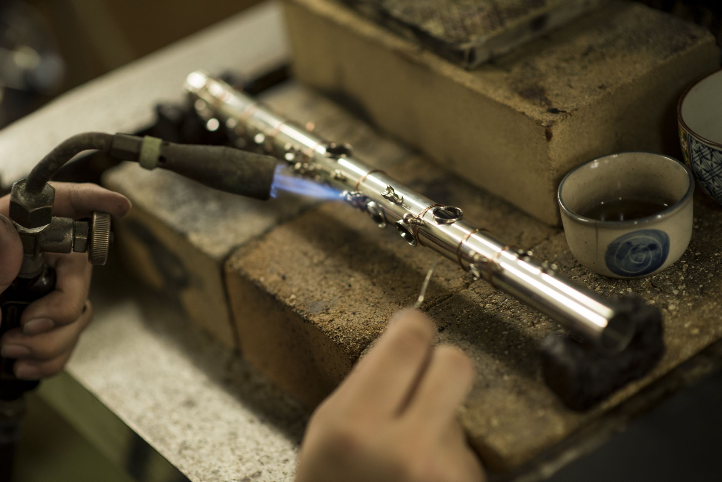 Unsaubere Arbeit könnte dazu führen, dass Lötstellen unter Belastung aufbrechen oder überschüssiges Lötzinn sichtbare, unerwünschte Spuren hinterlässt. Deshalb wird jeder einzelne Lötpunkt sorgfältig kontrolliert und bei Bedarf nachbearbeitet – ein entscheidender Schritt auf dem Weg zu einer technisch und optisch makellosen Miyazawa-Querflöte.