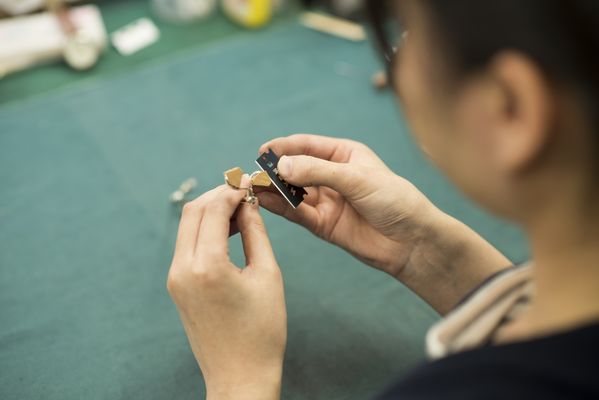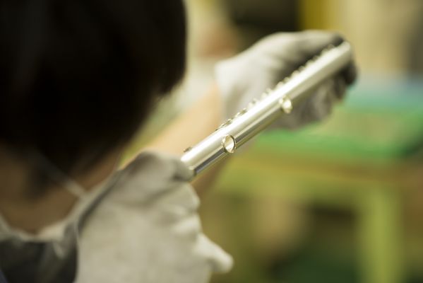 Die Endmontage und abschließende Prüfung einer Miyazawa Querflöte erfordern umfassende Fachkenntnis und langjährige Erfahrung im Flötenbau. Erst wenn alle Einzelelemente gefertigt und sorgfältig vorbereitet sind, wird das Instrument Schritt für Schritt mit sämtlichen Komponenten wie Korken, Polstern, Mechanikteilen ausgestattet.
