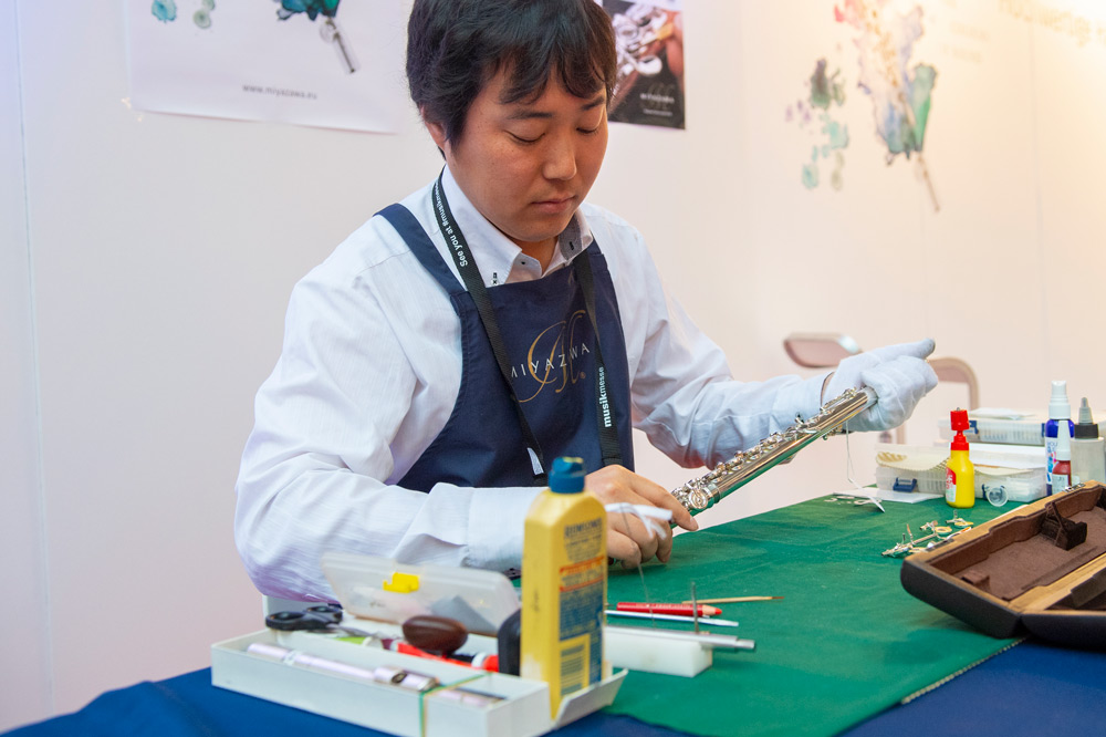 Hiromichi Sakai bot vielen Messe Besuchern den besonderen Service einer kostenlosen Inspektion der eigenen Querflöte an. Unser Cheftechniker inspizierte ca. 30 Instrumente und reparierte kleinere Dinge direkt an Ort und Stelle.